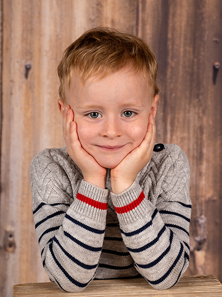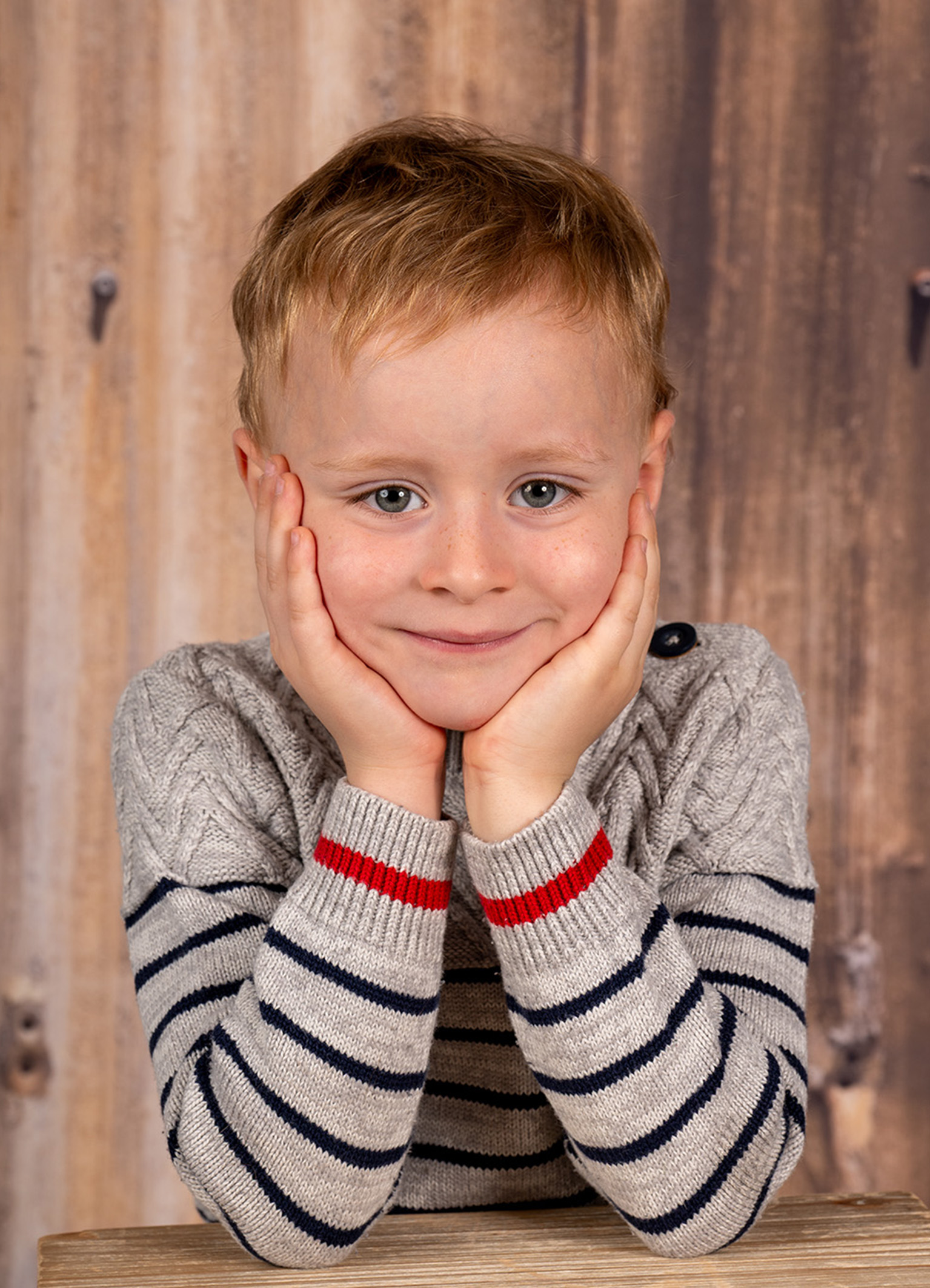 Le numérique nous offre de nombreuses possibilités : plusieurs prises de vue pour choisir la meilleure, mais surtout un travail de post-production poussé. Nous corrigeons les imperfections (petits boutons, griffures, etc.) et supprimons les éléments gênants pour sublimer chaque portrait, sans dénaturer l’image. Nous travaillons souvent sur fond neutre, ce qui permet d’ajouter ensuite un fond numérique personnalisé. Le choix est vaste : sobre, coloré, classique ou créatif, selon vos préférences. Nous utilisons également des décors studio plus sobres en tissu, pour un portrait épuré et centré sur l’enfant.